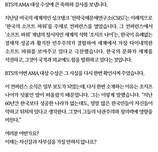 문재인 대통령 방탄소년단 AMA 대상 수상 축하