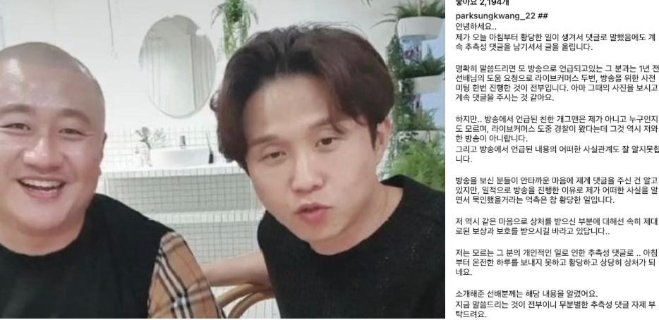 이에 박성광은 인스타그램에 애로부부의 당사자인 임성훈과는 1년 전 선배의 도움 요청으로 라이브커머스 두번 방송과 방송을 위한 사전미팅을 한 번 진행한 것이 전부라며 방송에서 언급된 개그맨은 제가 아니고 누구인지도 모르고 방송을 진행한 이유로 자신이 알면서 묵인했을 거라는 억측은 참으로 황당한 일이라고 해명했다.