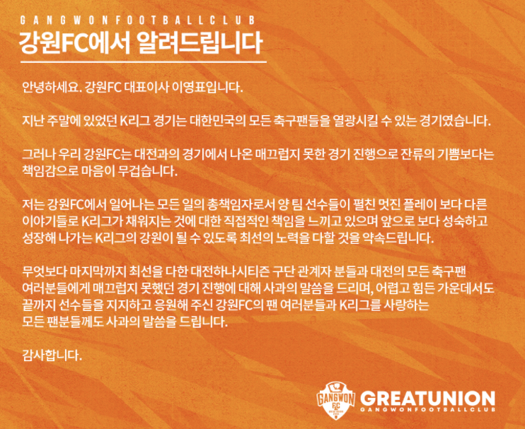강원FC의 이영표 대표는 K리그 승강 플레이오프 경기 2차전에서 발생한 볼보이 경기 지연 논란에 대해 공식 사과했다. 이영표 대표는 홈페이지에 공식 성명을 내고 최근 볼보이 논란에 대한 입장을 직접 밝혔다.