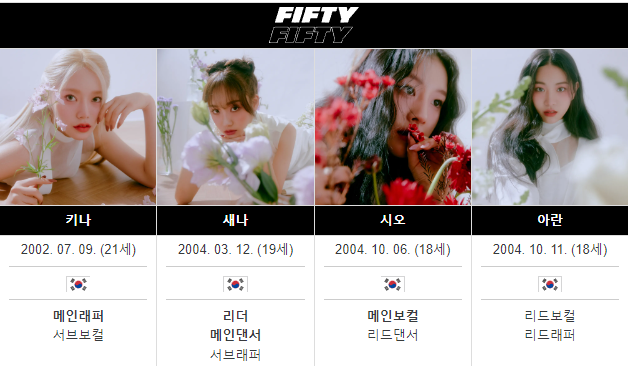 피프티 피프티는 2022년 11월 18일에 데뷔한 어트랙트 소속 4인조 걸그룹이다. 멤버는 키나, 새나, 시오, 아란으로 모두 한국 국적이며 2004년생에서 2002년생으로 구성된 걸그룹으로 글로벌 케이팝 아티스트 순위는 방탄에 이어 2위에 올라 블랙핑크보다 한단계 앞선다.