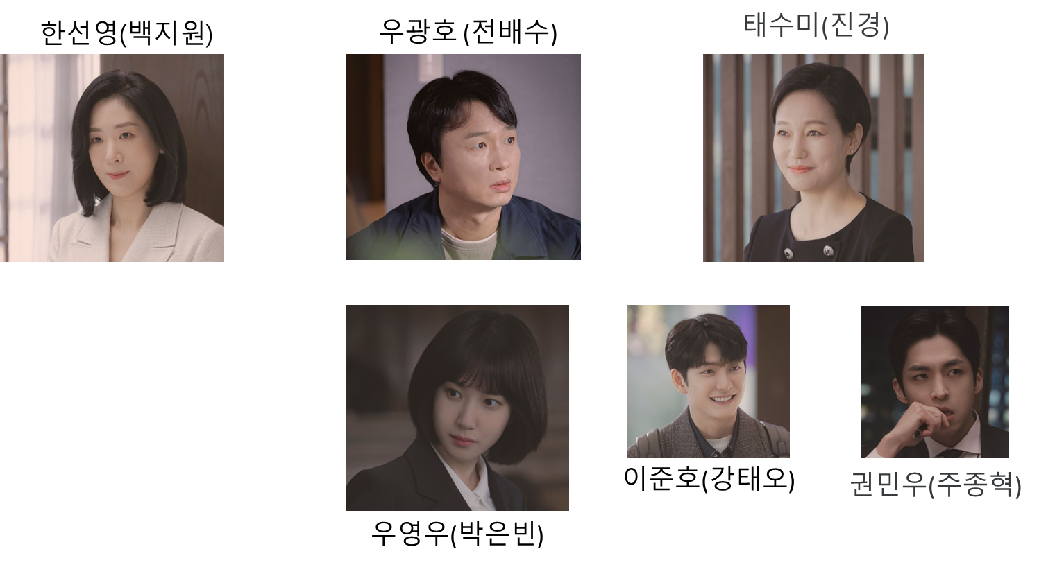 위 관계도를 보면 우광호는 법대생 시절 사랑에 빠져 아이가지 갖게 돼 법조인이 아닌 미혼부의 길을 선택한다. 한바다의 대표 한선영이 우광호를 찾아 선배라고 한다. 2년 선배이다. 태산의 태수미는 한선영의 동기이다. 일단 여기까지 단서로 친모를 찾아보자. 한선영은 우광호를 찾아가서 사진을 보고 영우가 친모를 닮았다고 한다. 이때 보통 자신이 친모라면 친모를 닮았다고 하지는 않을 것이다.